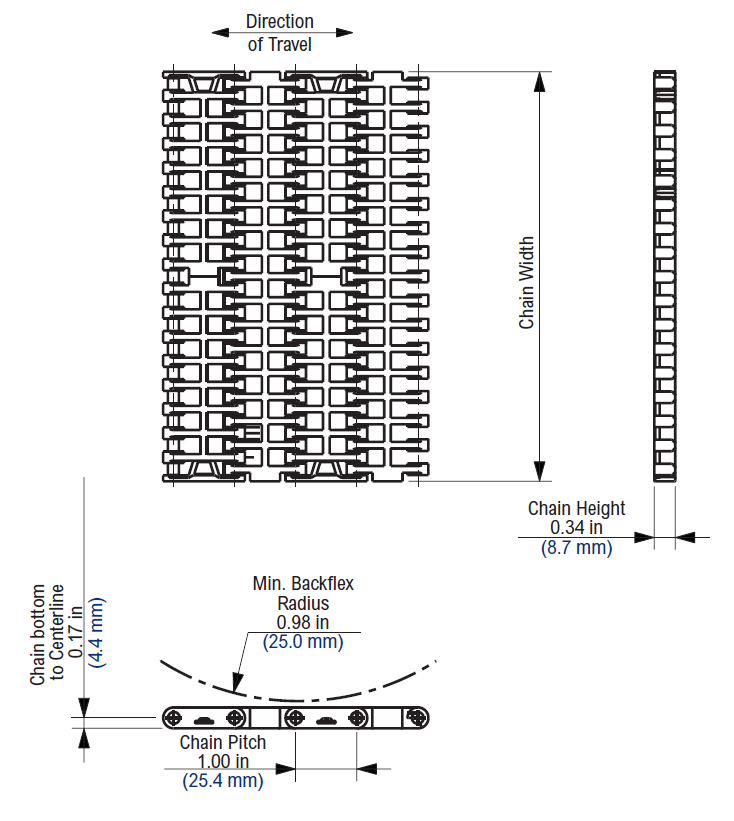 REXNORD 1000 XLG FGDP Flush Grid Molded-To-Width (MTW) MatTop Chain with Positrack (DP – Double Positrack) Tracking Guides прямоходная модульная лента открытого типа 40% с шагом 25,4 мм (1 дюйм) с фиксированной шириной 85 мм. В нижней части ленты по краям размещены двусторонние упоры для фиксации на направляющих конвейера (позитрак), которые не позволяют ленте смещаться вбок в процессе работы (44,5 мм между направляющими)
