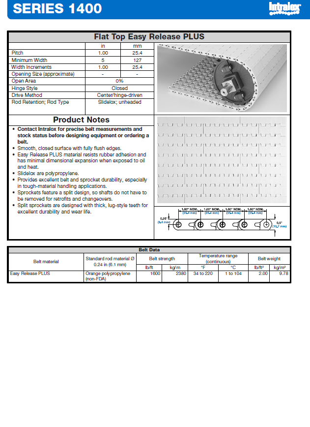 - Series 1400 OPENPIECE TM Live Transfer Flat Top (с гладкой закрытой поверхностью, с двусторонним упором в нижней части ленты для фиксации ленты на конвейере. Обеспечивает плавный сход продукции с одной линии на другую)