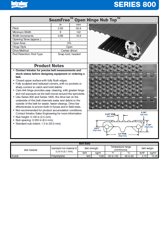 - Series 800 Seam Free TM Open Hinge Nub Top TM (с закрытой поверхностью с нанесёнными выступами – точками с закруглёнными вершинами и с увеличенной степенью очищаемости от остатков перемещаемой продукции. Минимизировано расстояние между модулями на собранной конвейерной ленте)