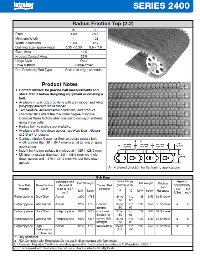 - Series 2400 0.4 in High Radius Friction Top (2.2) (c открытой поверхностью 42%, с нанесёнными резиновыми накладками высотой 0.4 дюйма (10,1 мм) с выровненной поверхностью для фиксации перемещаемой на плоскости ленты продукции, коллапс фактор 2.2)