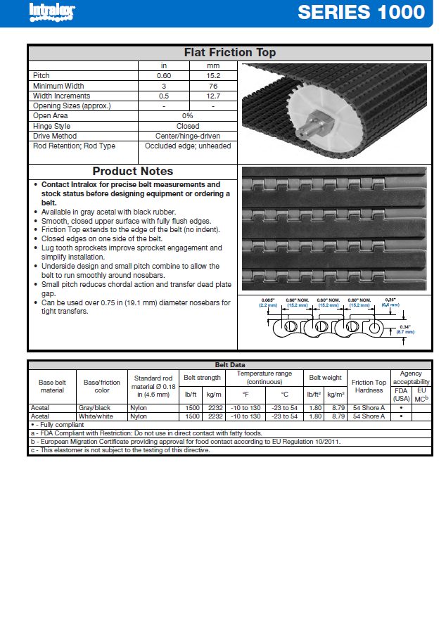Intralox S.1000 Flat Friction Top прямоходная модульная лента с шагом 15,2 мм (0,6 дюйма) с закрытой поверхностью с нанесёнными резиновыми накладками с плоской гладкой поверхностью для фиксации перемещаемой на ленте продукции. Не рекомендуется для условий накопления перемещаемой продукции на ленте.