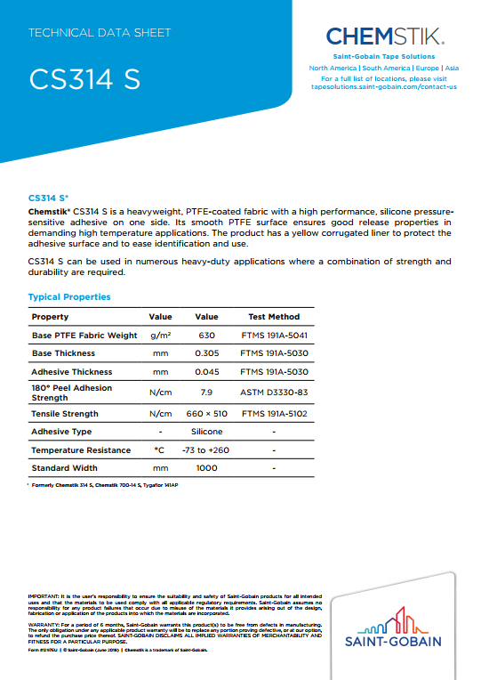 Самый толстый и прочный скотч, армированный стеклотканью. CS 314 используется в случаях, когда на материал оказывается сильное механическое воздействие. Например, CS 314 может использоваться для защиты нагревательных элементов при сварке ПВХ. Также, этот материал применяют на оборудовании для запайки упаковки, где лента движется на большой скорости под большой нагрузкой.